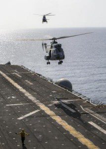 An UH-1N Huey assigned to Marine Medium Tiltrotor Squadron (VMM) 266 (Reinforced), 26th Marine Expeditionary Unit (MEU), takes off from the flight deck of the USS Kearsarge (LHD 3), at sea, Sept. 30, 2013. The 26th MEU is a Marine Air-Ground Task Force forward-deployed to the U.S. 5th and 6th Fleet areas of responsibility aboard the Kearsarge Amphibious Ready Group serving as a sea-based, expeditionary crisis response force capable of conducting amphibious operations across the full range of military operations. (U.S. Marine Corps photo by Sgt. Christopher Q. Stone, 26th MEU Combat Camera/Released)